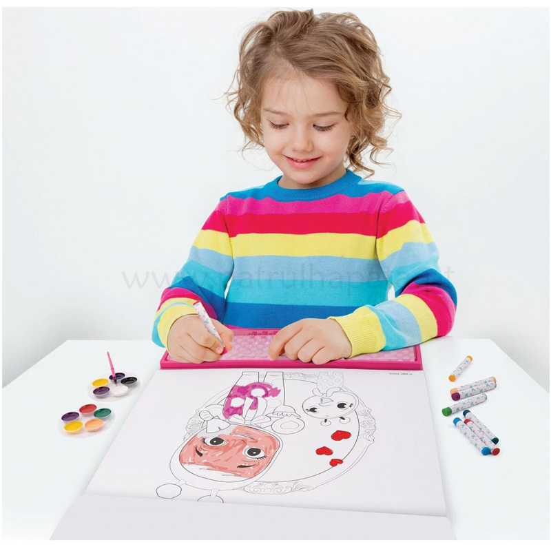Cada conjunto inclui - 1 bloco de desenho com 25 páginas pré-impressas com desenhos de cada herói - 10 aguarelas - 1 pincel - 8 lápis de cor - 1 folha de autocolantes
