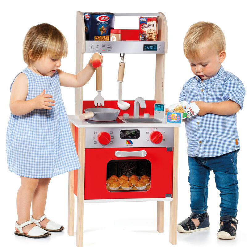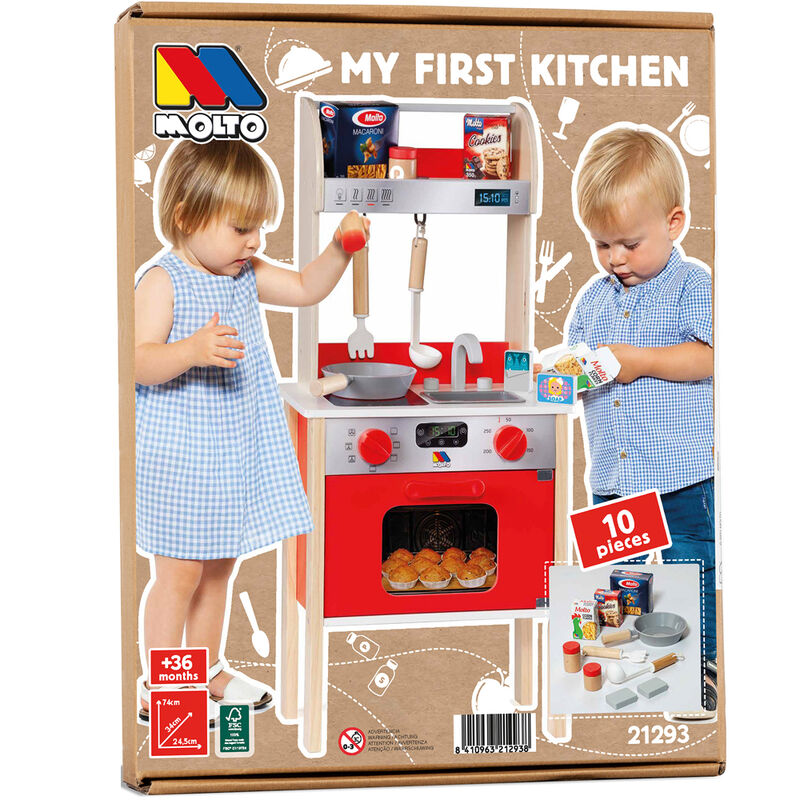 Idade: 36 meses. Tamanho: 34x23x73cm. Cozinha de brinquedo de madeira, com pia, torneira, placa de indução, forno com seleção de temperatura e controles de cozimento e com 10 acessórios para começar a jogar.