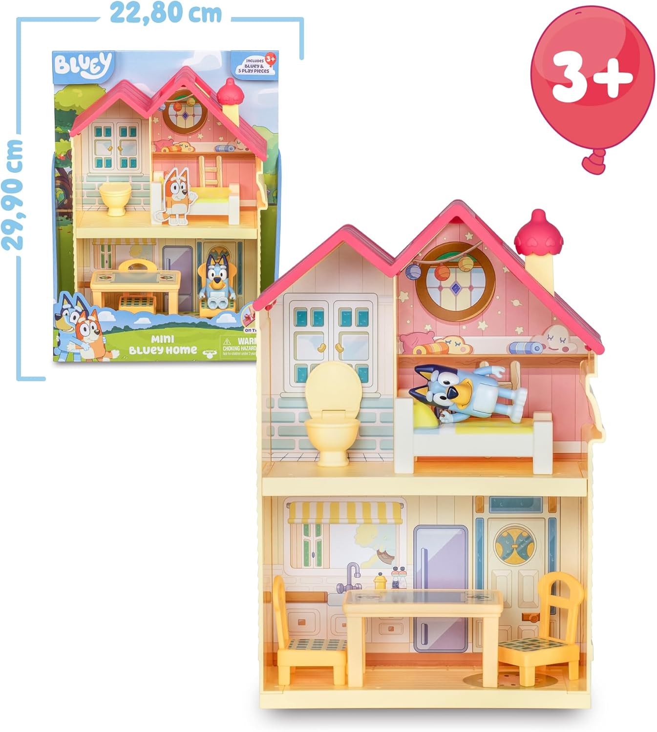 Inclui uma casa com três quartos diferentes com móveis como uma cama, uma mesa com cadeiras e também, com uma figura de Bluey!