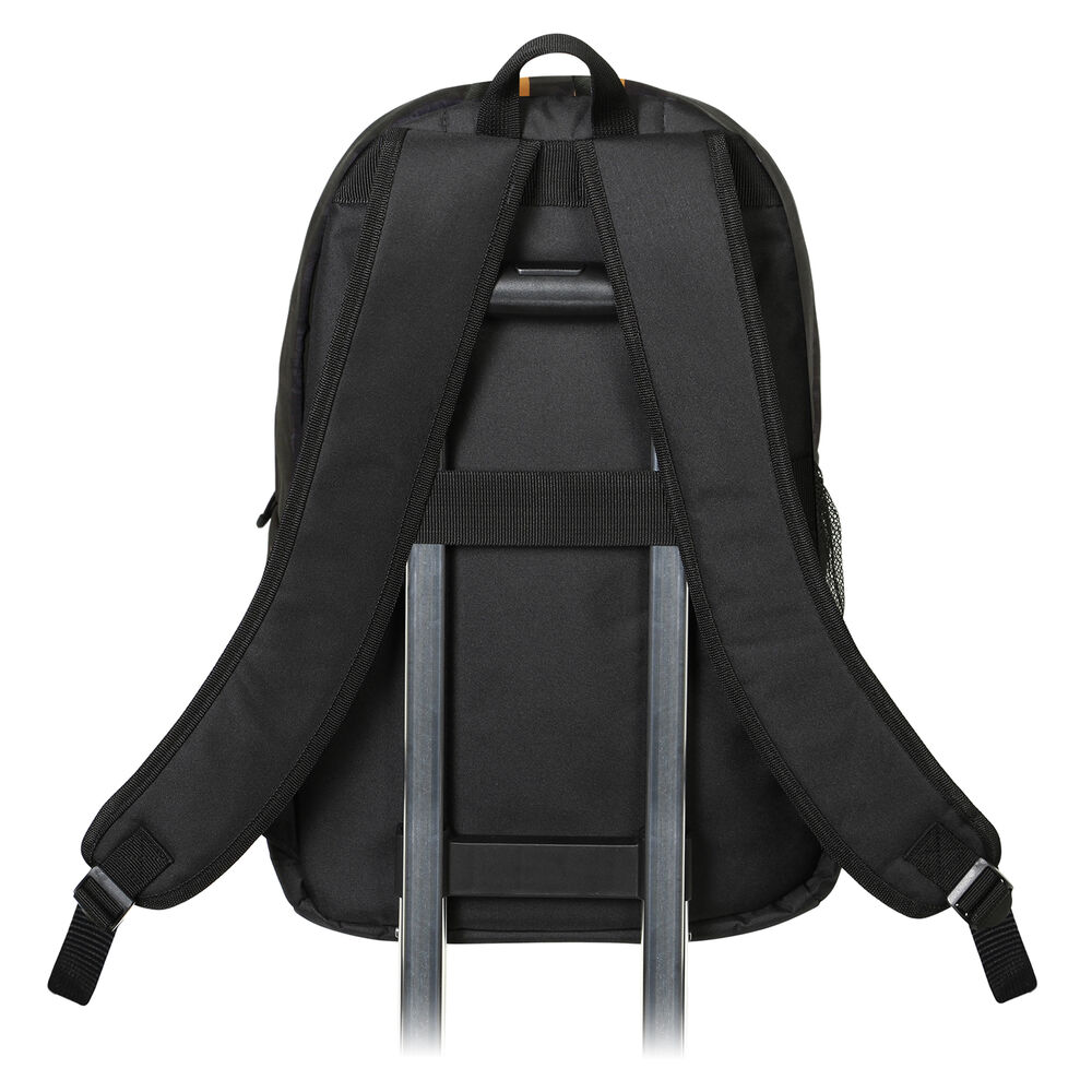 Mochila urbana leve com um único compartimento. Forro interno com bolso para dispositivos eletrônicos. Bolso frontal, alças acolchoadas ajustáveis ​​e alça traseira adaptável ao trolley