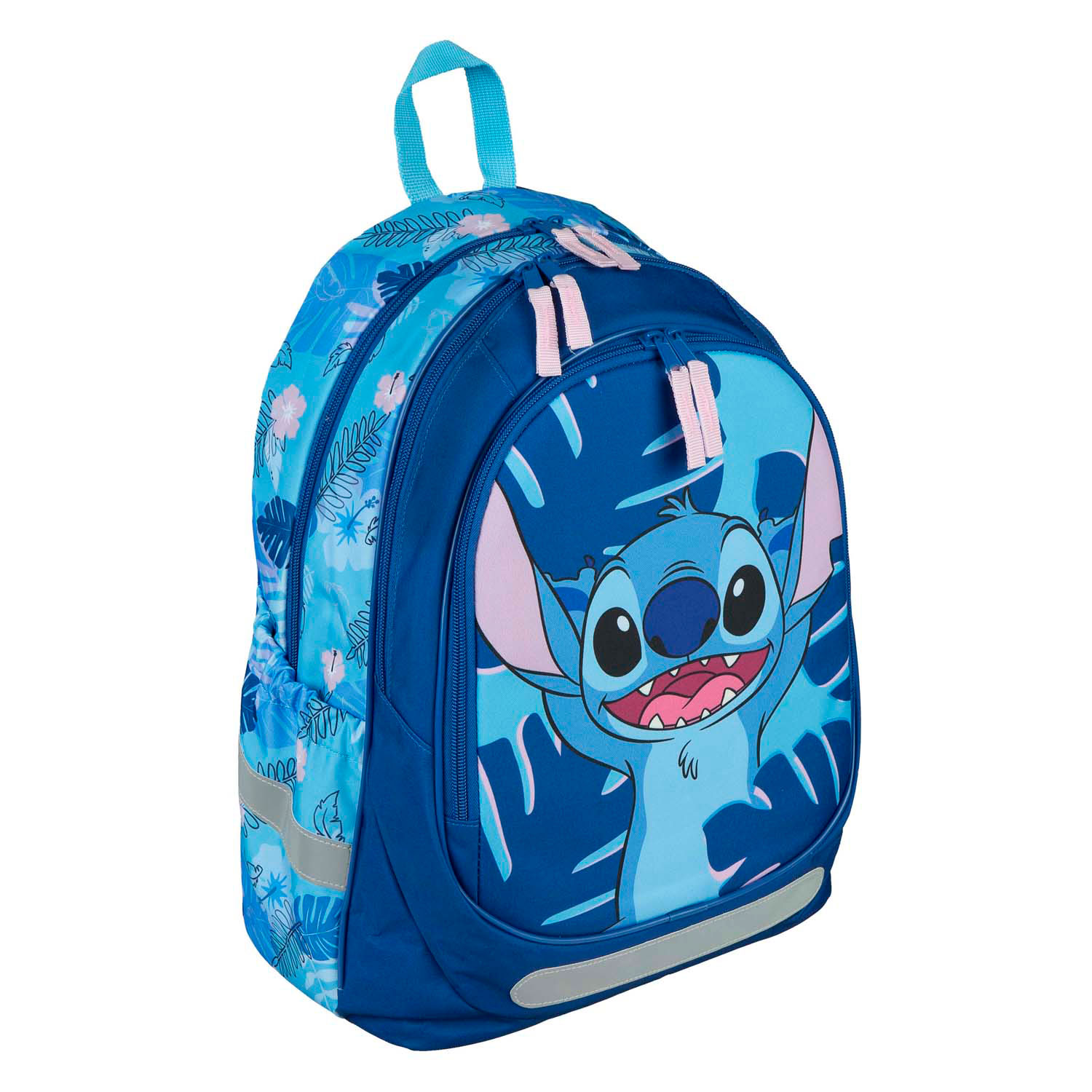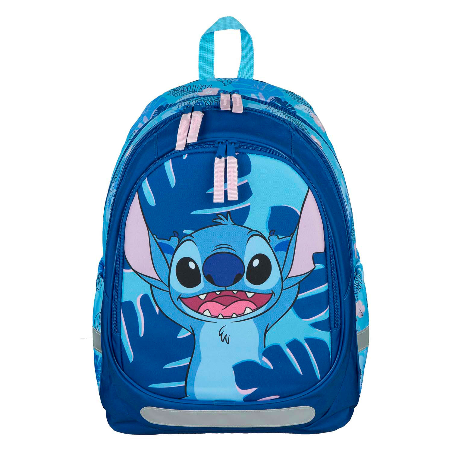 Mochila Blue Stitch com 3 compartimentos grandes e suporte elástico para garrafas. A bolsa tem alças ajustáveis ​​e acolchoadas e mede 43 x 31 x 19 cm.