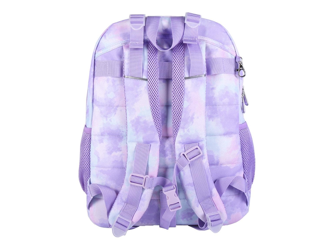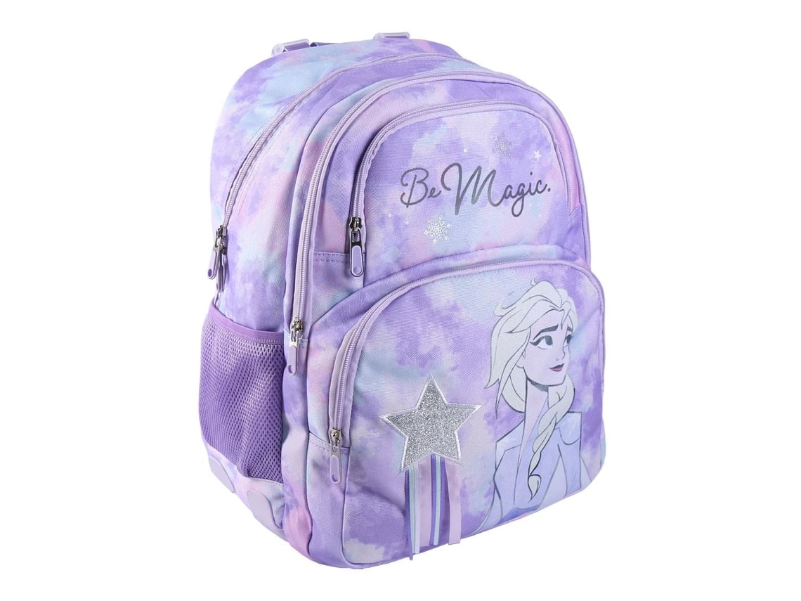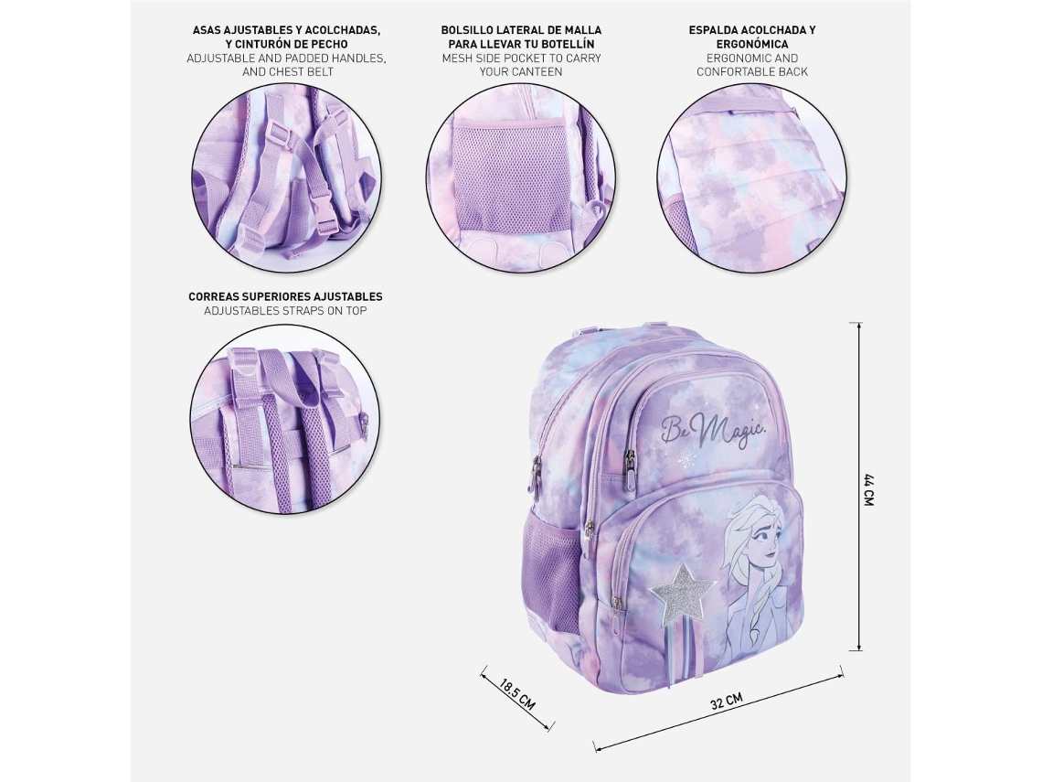 Mochila Frozen. A cor principal é roxa e a superfície é estampada por toda a parte. Possui dois compartimentos e fecho de correr. Possui duas alças acolchoadas e ajustáveis ​​para transportar nas costas e uma alça de mão na parte superior. Dois bolsos exteriores com fecho. Apresenta um motivo estampado. Medidas aproximadas: 44 x 32 x 18 cm. Produto oficial e original.