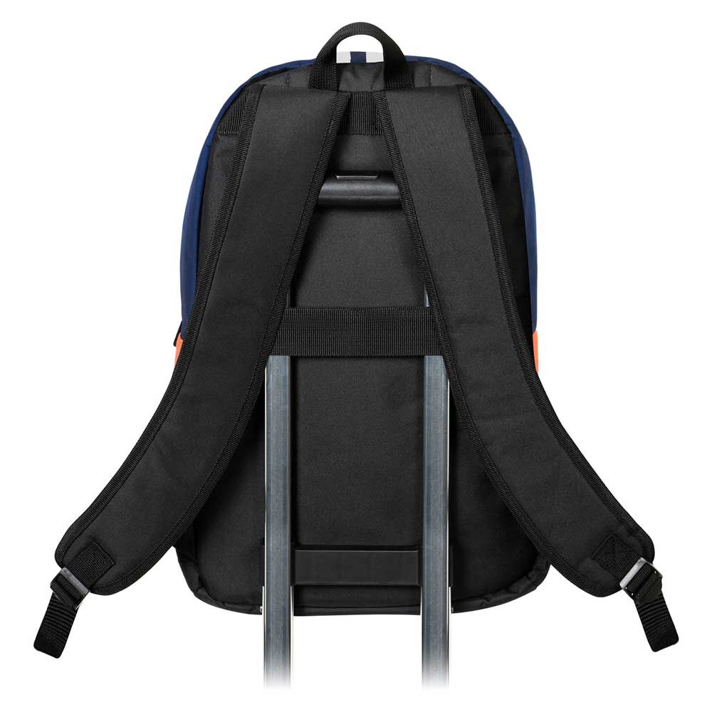 Mochila urbana leve com um único compartimento. Forro interno com bolso para dispositivos eletrônicos. Bolso frontal, alças acolchoadas ajustáveis ​​e alça traseira adaptável ao trolley