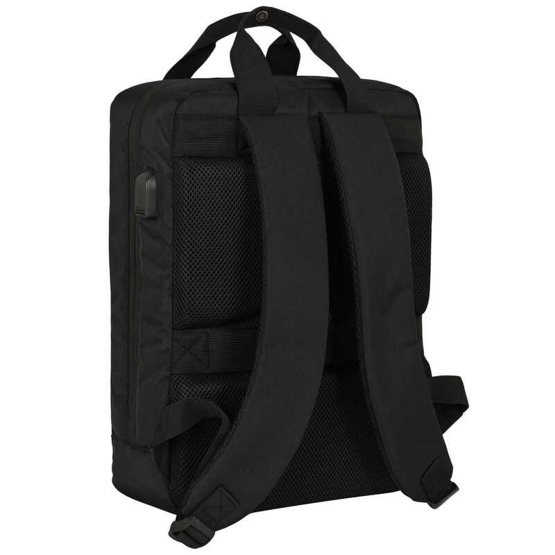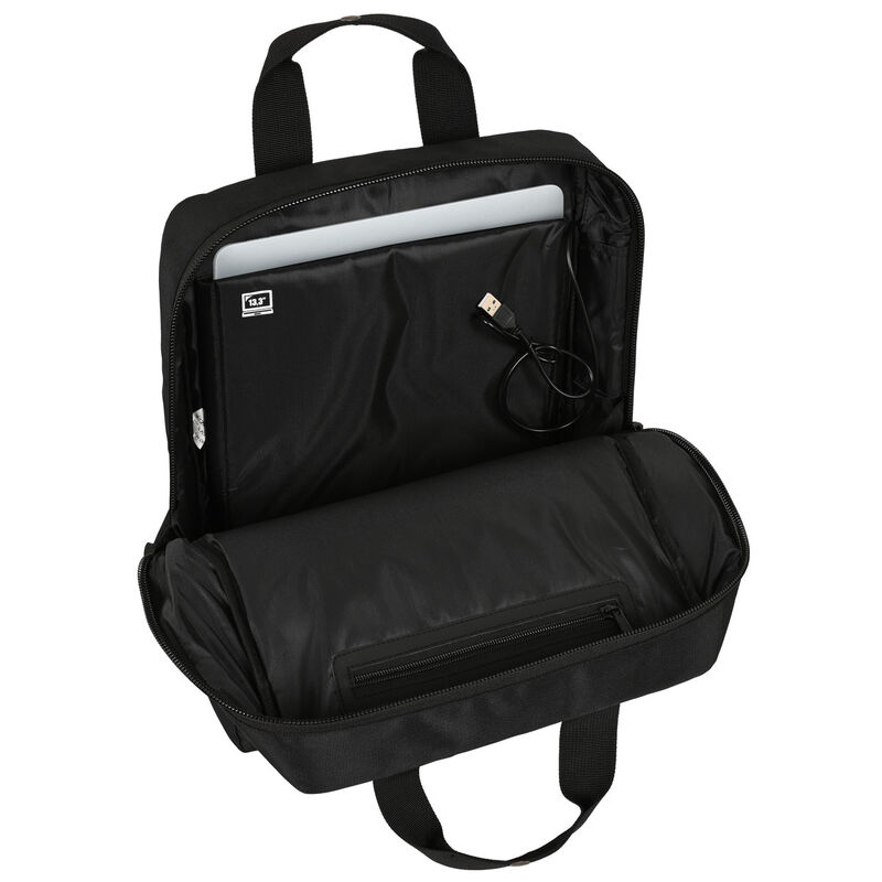 Tamanho: 29x39x12cm. Compartimento principal de grande formato com zíper com acomodação para um laptop de 13,3. Bolso interno com zíper. Extrator de zíper principal duplo para facilitar a abertura. Bolso frontal grande com fecho de aba magnética. Conector USB externo para carregar o celular. Costas e ombreiras acolchoadas e ergonômicas, com mesh respirável. Alças de fechamento em PVC entre as ombreiras para mantê-lo totalmente preso ao corpo. Alça traseira adaptável à alça da mala. Alça na parte superior.
