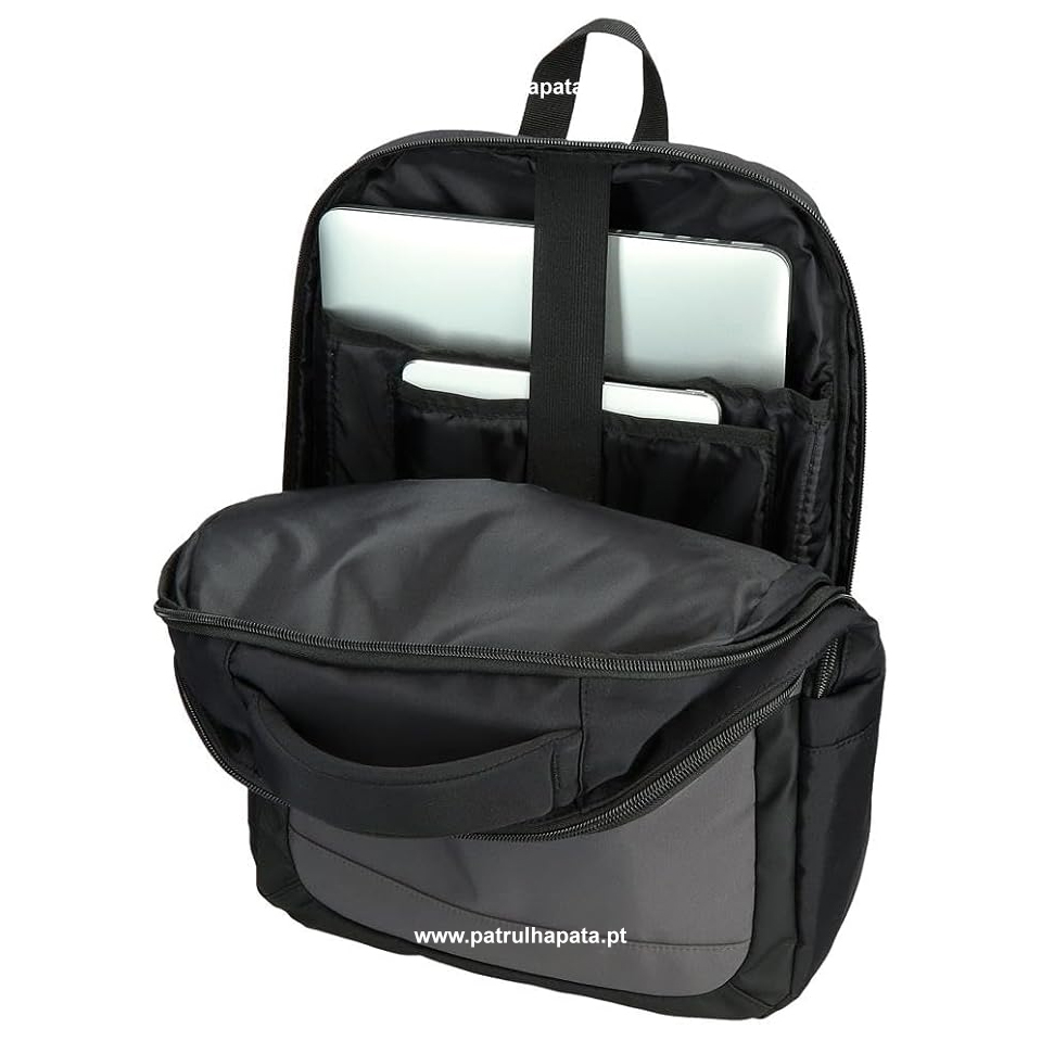 Mochila de 31 cm x 44 cm x 15 cm, fabricada em poliéster. Compartimento principal duplo com espaço para um computador e outro para um tablet. Organizador interior com dois compartimentos para canetas e dois compartimentos para guardar acessórios, um deles com fecho. Bolso frontal com fecho de correr e dois compartimentos para guardar acessórios.