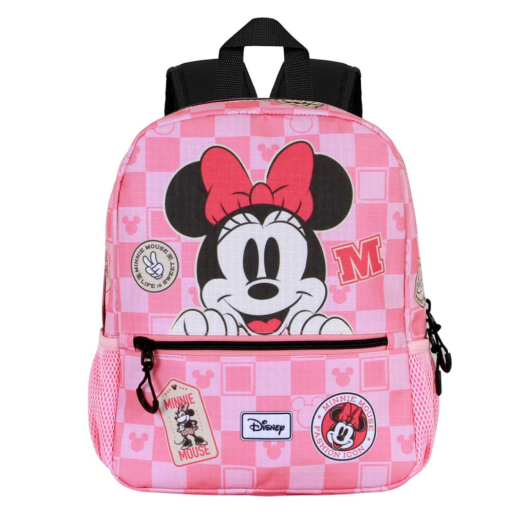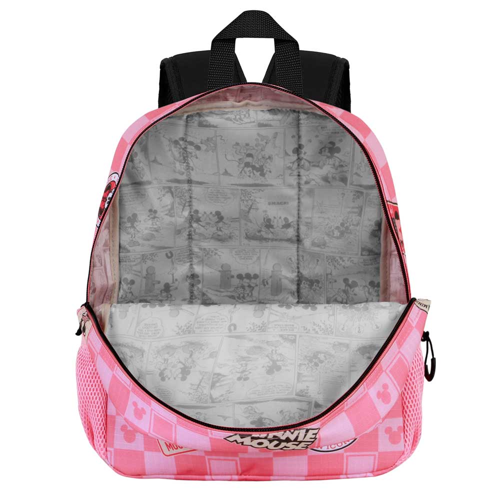 Mochila Sweet Minnie Mouse Journey. Minnie Mouse. Mochila pequena com um compartimento principal, um bolso frontal plano com zíper e dois bolsos laterais de tela. Corpo em material ripstop durável com moderada repelência à água. Forro interno estampado. Alças de ombro acolchoadas ajustáveis ​​e costas acolchoadas.