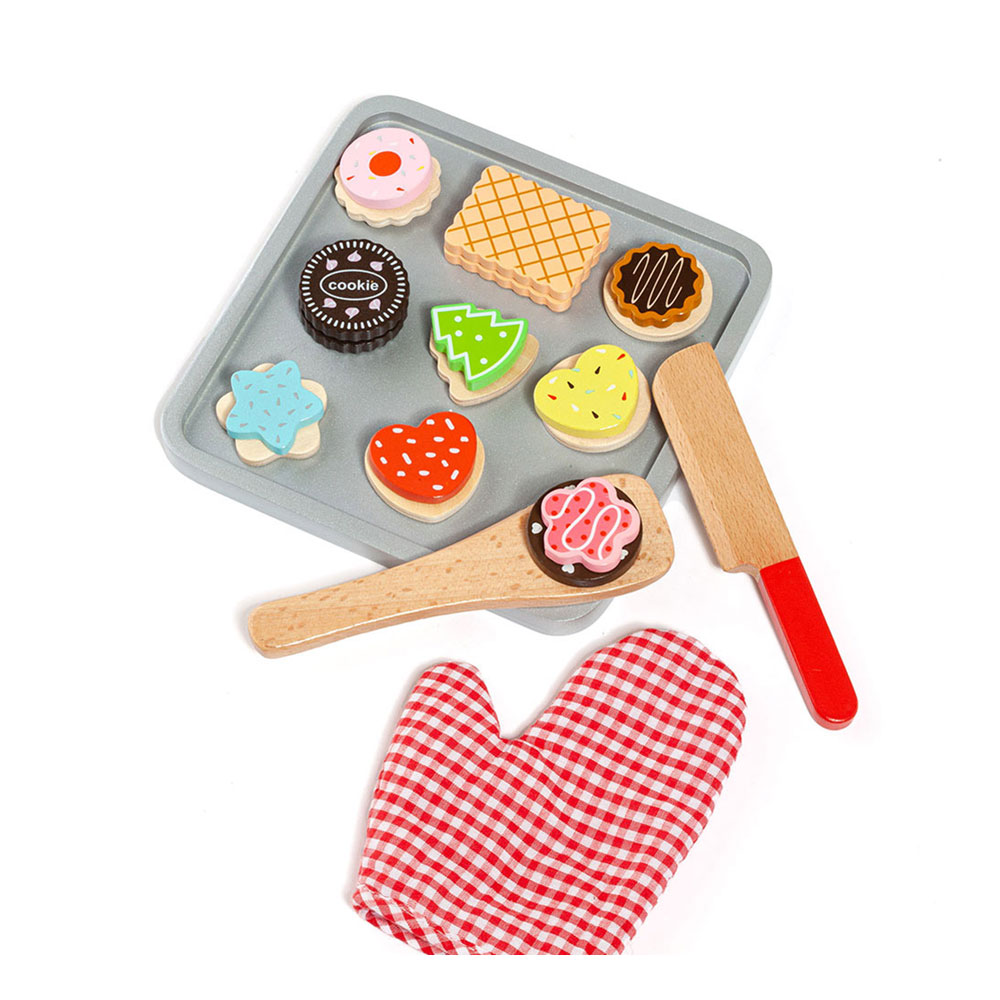 Conjunto tabuleiro de bolachas de madeira. Desmontáveis com velcro para fazerem de conta que estão a cozinhar e colocar no forno como a mamã ou o papá. Cumpre todas as normas de segurança exigidas.