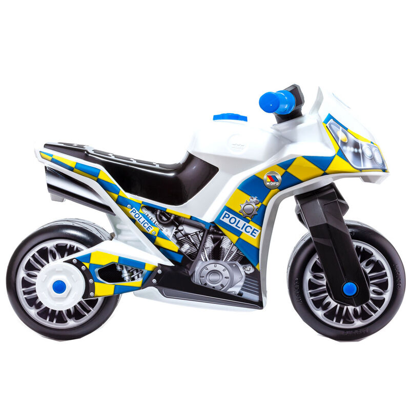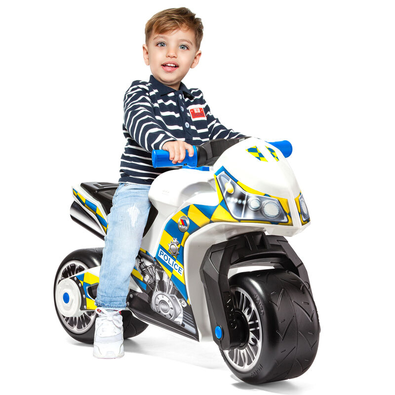 Idade: +18 meses. Tamanho: 73x47x32cm. Fabulosa motocicleta de passeio da polícia de Molto Cross com rodas todo-o-terreno para que você possa desfrutar de pilotar onde quiser. Até na praia.
