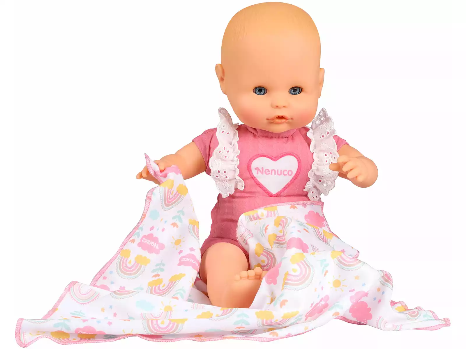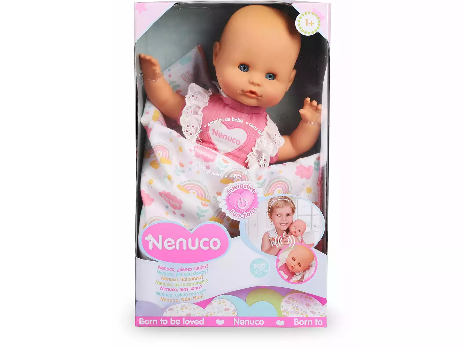 Inclui: 1 boneco bebé Nenuco com sons realistas de bebé, olhos azuis com pálpebras que se fecham, conjunto cor-de-rosa com coração da Nenuco e 1 mantinha de cor branca com estampado especial a cores.