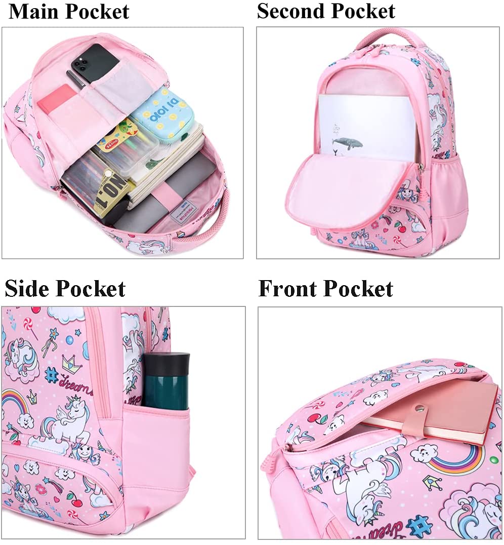 Grande capacidade: o tamanho da mochila para meninas é de 30 x 15 x 38 cm, cerca de 13 a 15 litros, mochila escolar com bolsos multiúsos, espaçosa para as meninas levarem tudo o que precisam para a escola. Modelo impermeável