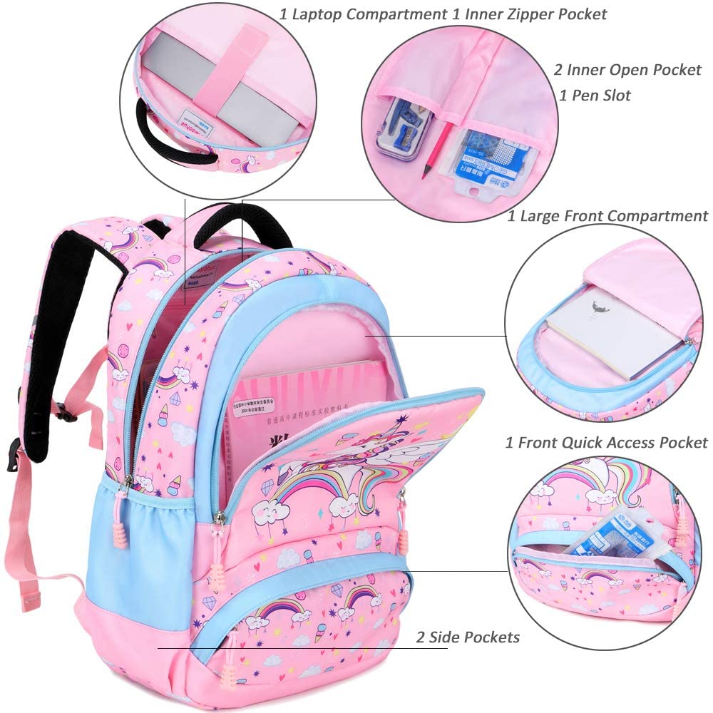 Grande capacidade: o tamanho da mochila para meninas é de 30 x 15 x 38 cm, cerca de 13 a 15 litros, mochila escolar com bolsos multiúsos, espaçosa para as meninas levarem tudo o que precisam para a escola. Modelo impermeável