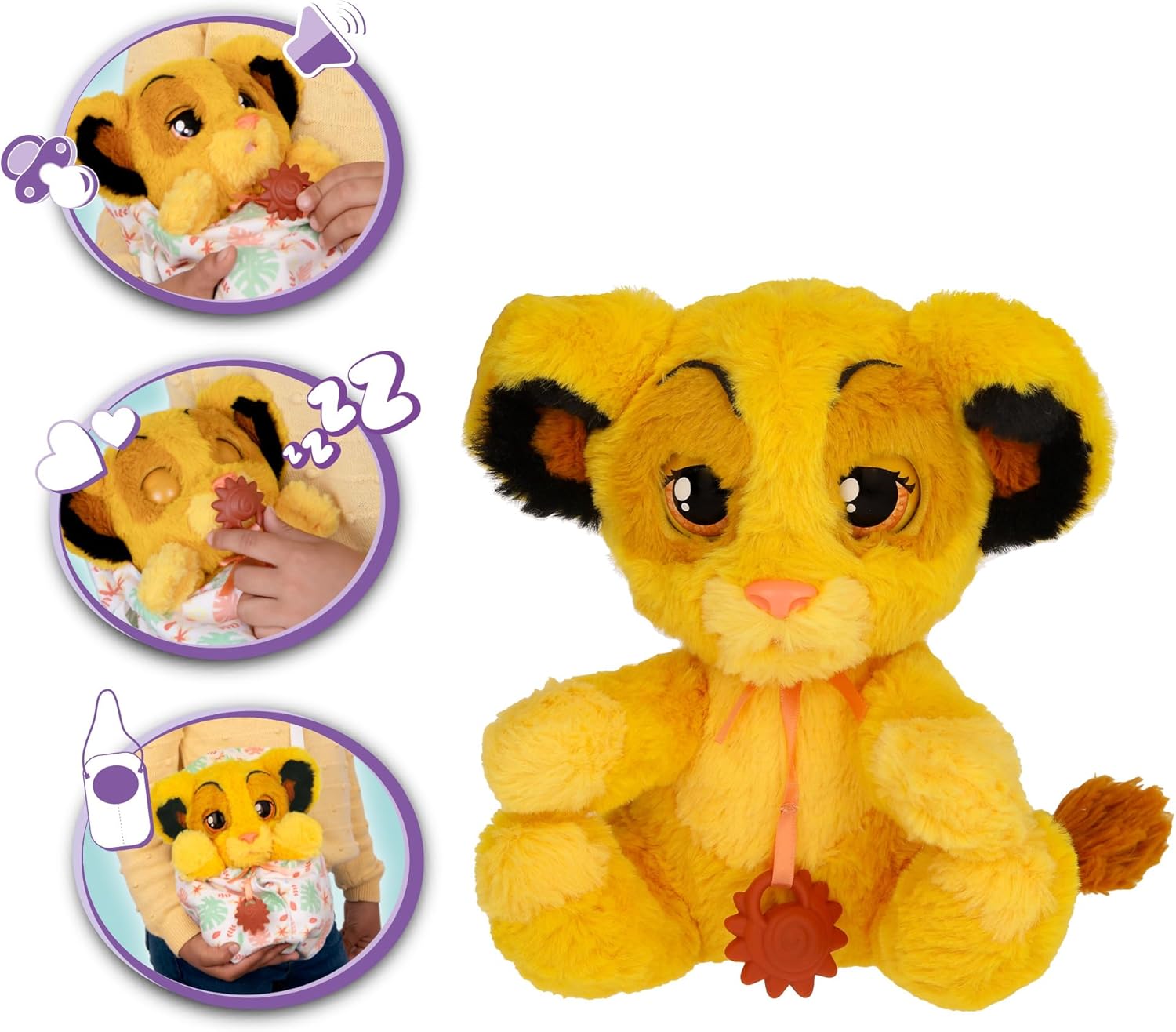 Peluche interativo: Este bebé Simba precisa que cuide dele, assim como muitos mimos Adormecido: Coloque a sua chupeta e fechará os olhos enquanto emite sons próprios de Simba Simba agora é um Baby Paw: Retire-o da sua bolsa e descubra o seu corpo macio e macio Leve-o consigo para onde quiser: Inclui um saco de enrolar personalizado moníssimo, para que possa levar o seu Simba consigo para qualquer lugar Simba tem 24 cm de altura e vem com a sua chupeta e saco As Baby Paws estimulam a criatividade das crianças brincando com pais e mostram a importância de respeitar e cuidar dos seus animais de estimação O presente perfeito para meninos e meninas de 3 anos ou mais tarde seja no Natal, aniversário ou depois de terminar a escola Pilhas incluídas.