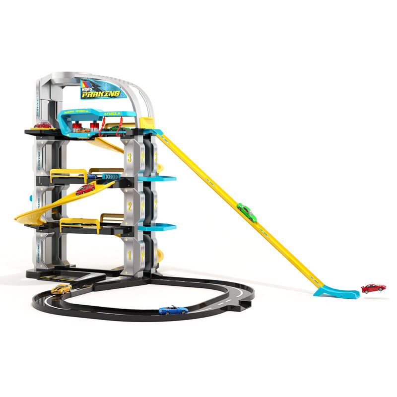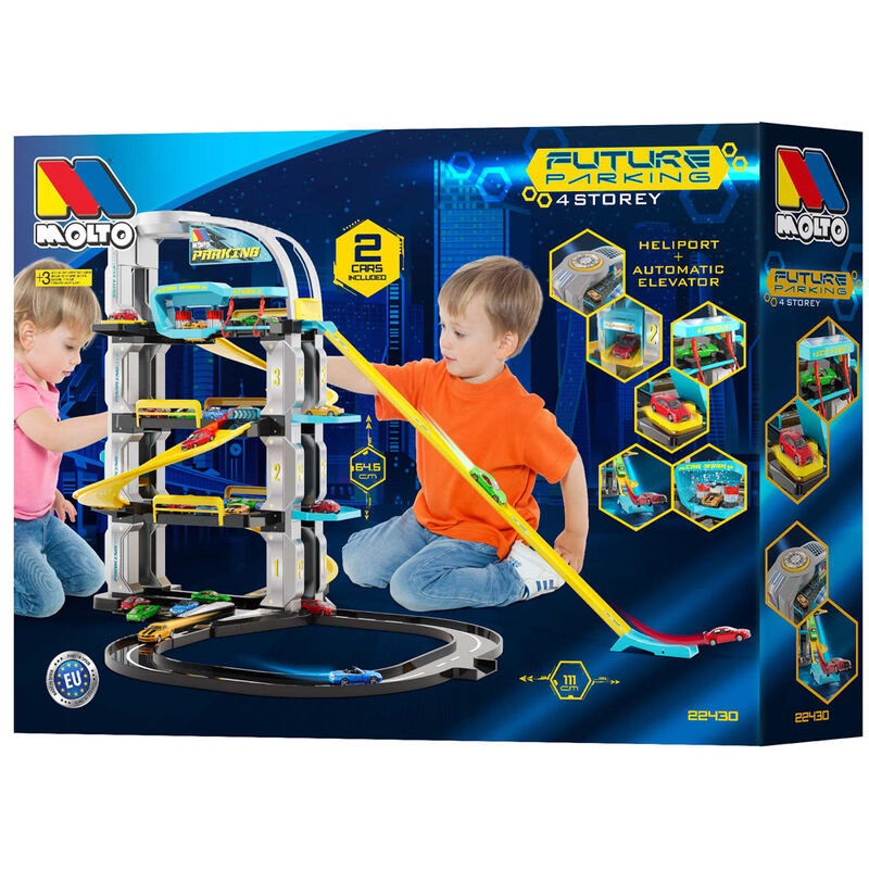 Idade: +3 anos. Tamanho: 65x106x80cm. Estacionamento com design futurista de 4 pisos. Tem muitas opções divertidas: Rampas, elevador automático, posto de gasolina, lava-jato e circuito ao ar livre para cronometrar os tempos de cada carro. Carros não incluídos.