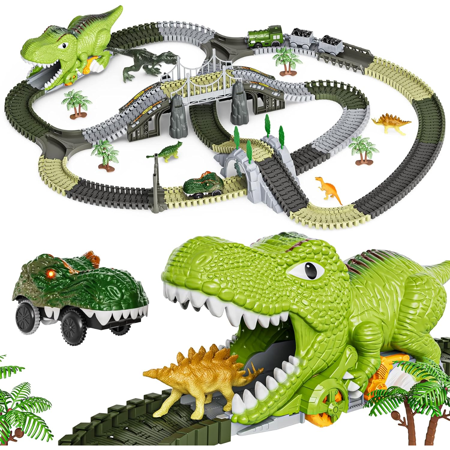 Dinossauro brinquedos de pista jogo: tumama dinossauro pista de corrida é composta por 281 peças de brinquedos de pista, incluindo 240 pistas flexíveis, 2 carros a pilhas (1 carro dinossauro, 1 carro locomotiva de brinquedo), 2 carros mina, 4 figuras de dinossauros, 1 túnel de dinossauro, 1 túnel de dinossauro, 1 Ponte, 1 Brinco, 1 porta, 2 pistas em forma de Y, 2 macacões, 8 árvores. O seu design avançado permite que as crianças criem o seu próprio reino de dinossauros.