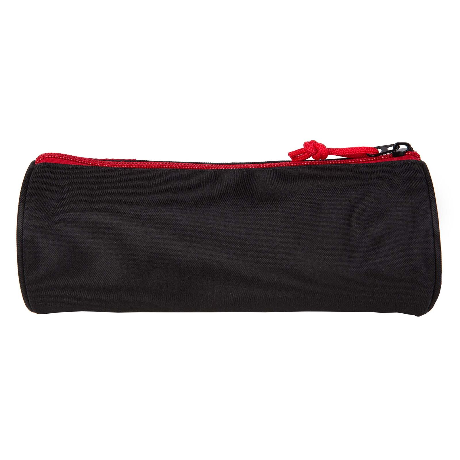 Estojo preto cilíndrico com fecho vermelho e desenho de nuvem vermelha