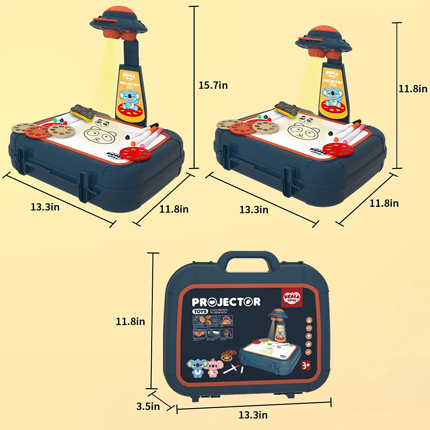 48 padrões e 6 discos: O quadro de desenho infantil tem seis tipos de discos de projeção: frutas, legumes, roupas, desportos, animais e meios de transporte. Cada disco tem oito padrões, o que representa um total de 48 padrões. O conjunto vem acompanhado por seis canetas coloridas e seis molduras para desenhares.