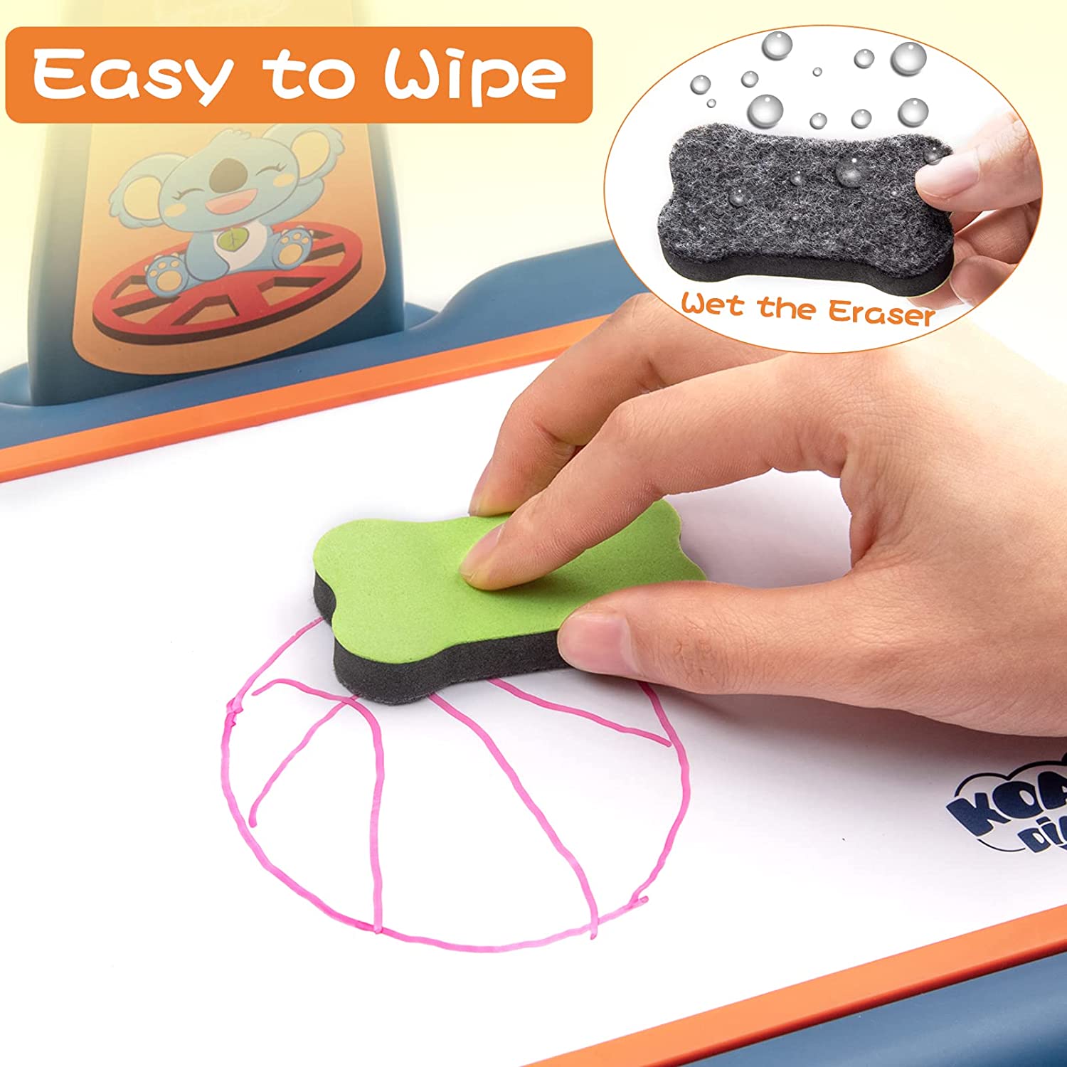 Fácil de apagar: todos os desenhos pintados no quadro infantil podem ser facilmente apagados, para que o seu filho possa criar um número infinito de desenhos. O estojo portátil é fácil de guardar e transportar, é feito de material ABS de alta qualidade, com bordas lisas e superfícies