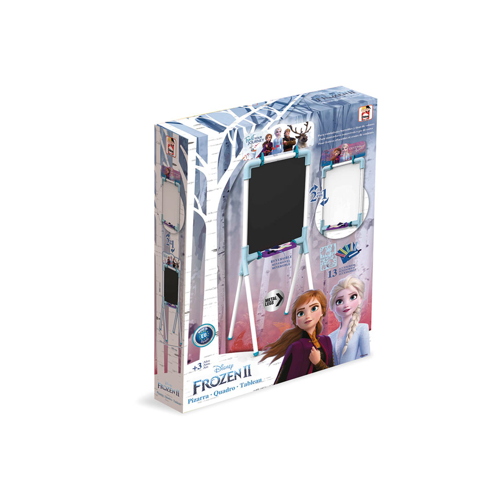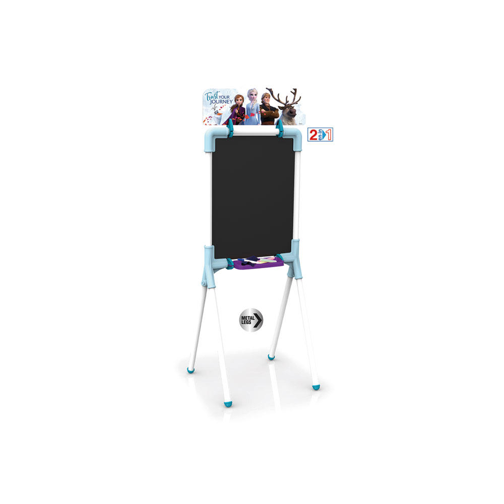 Quadro dupla face: louza para utilização com giz e superfície branca para utilização com marcadores. Inclui 10 paus de giz coloridos + 1 marcador + pano para apagar. Pernas em metal rígido.