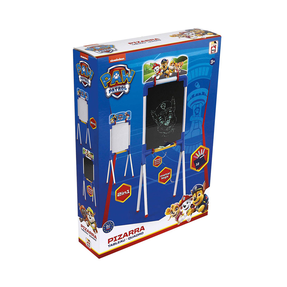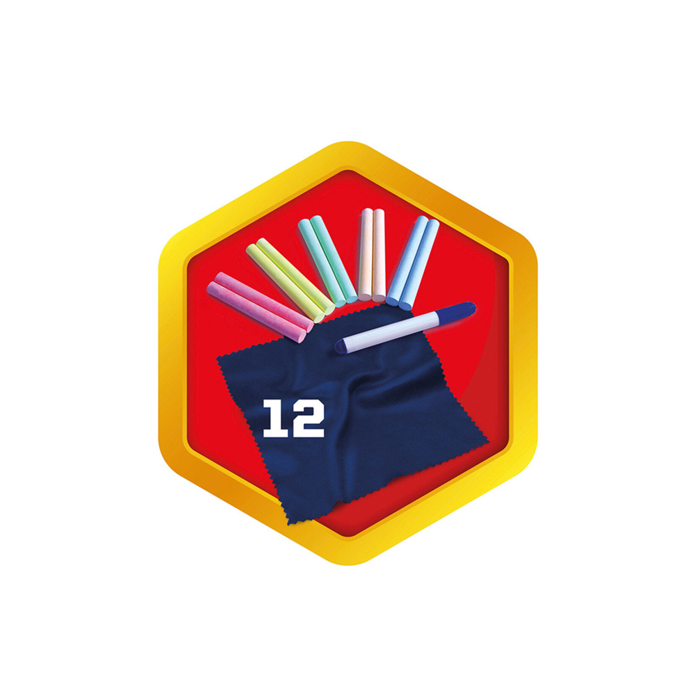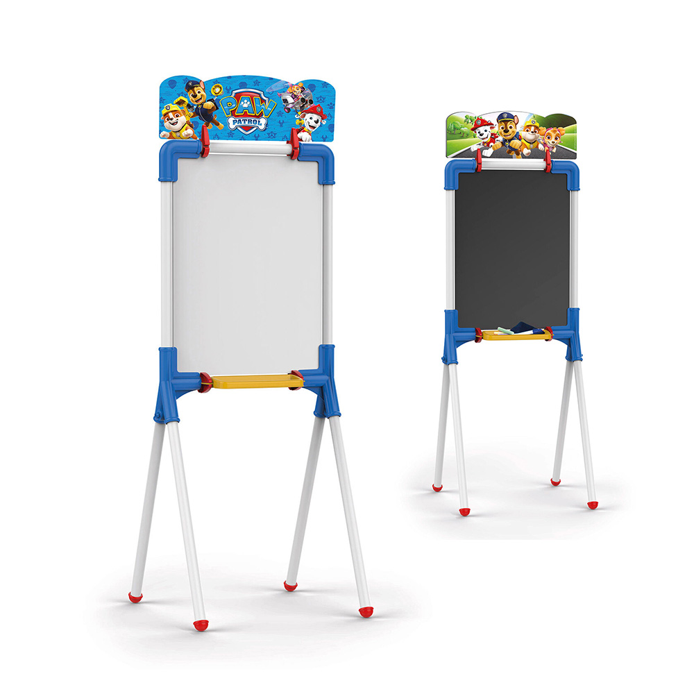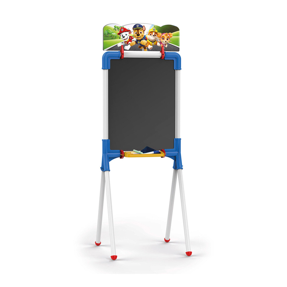 Quadro dupla face: louza para utilização com giz e superfície branca para utilização com marcadores. Inclui 10 paus de giz coloridos + 1 marcador + pano para apagar. Pernas em metal rígido.