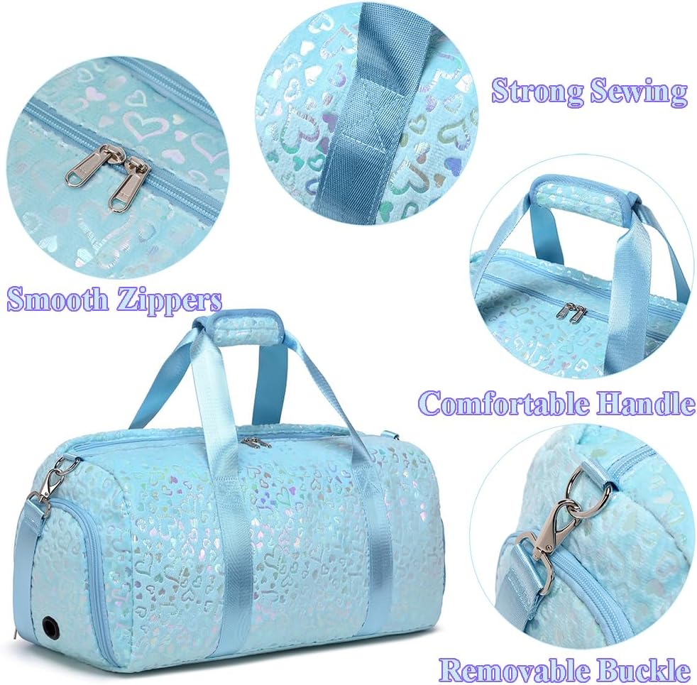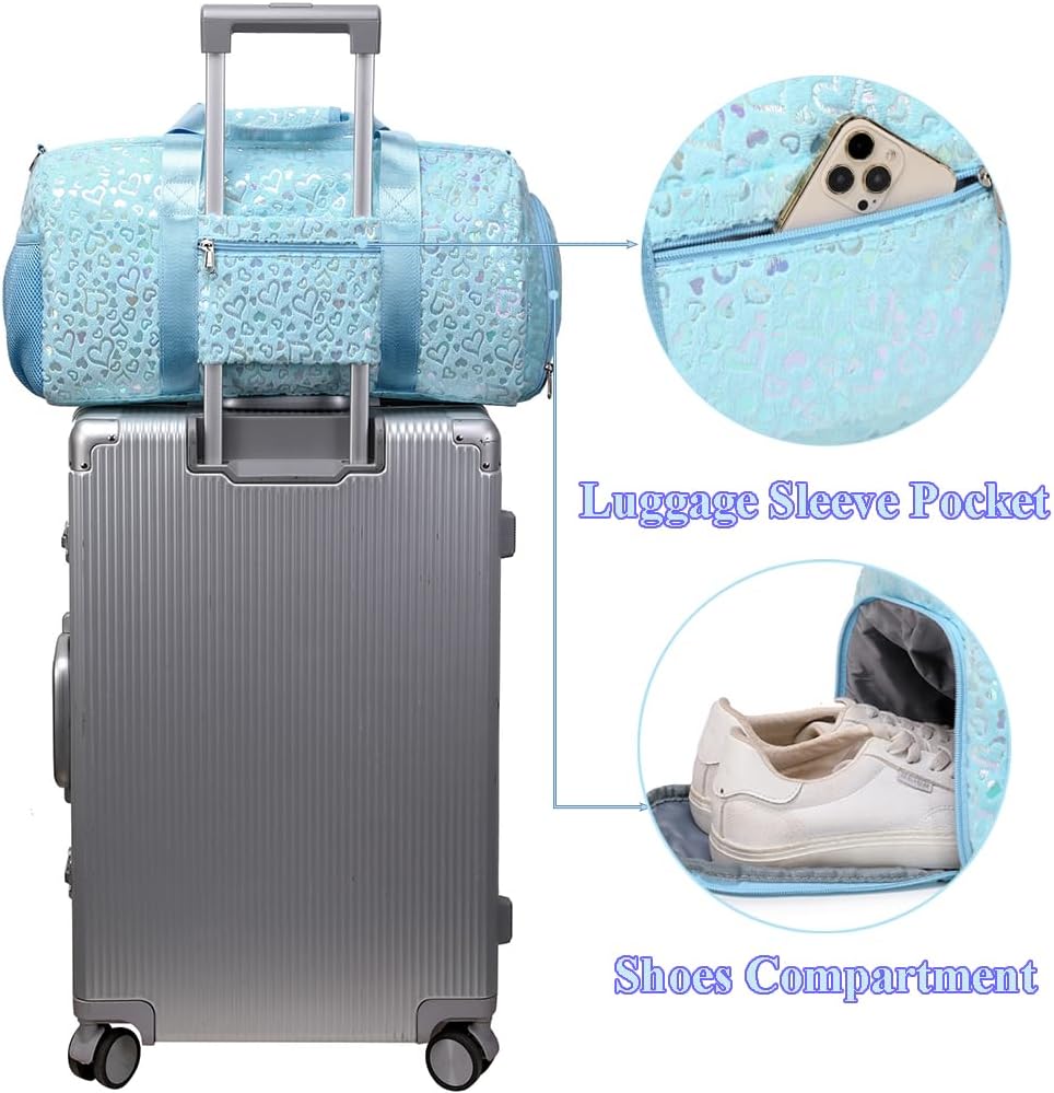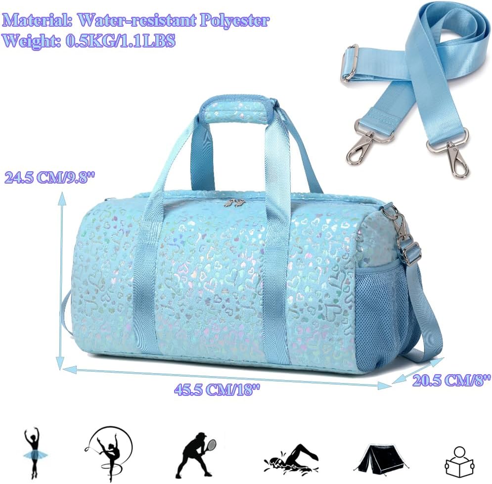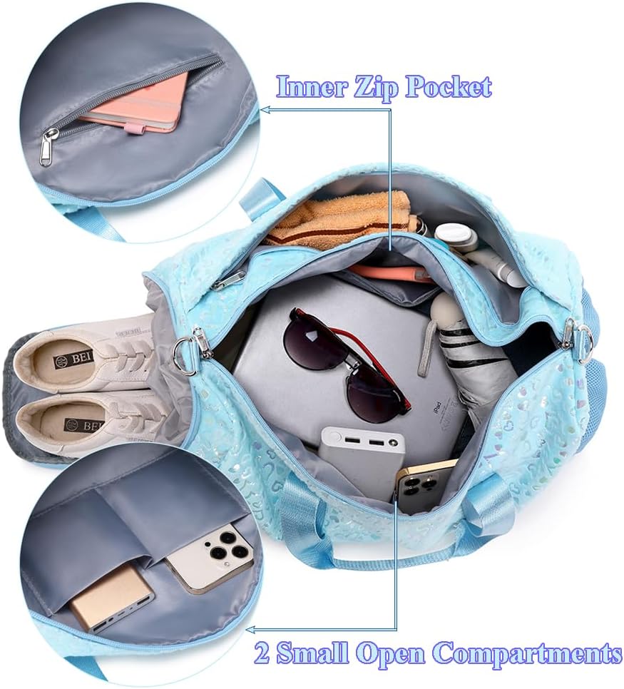 Fácil de guardar e transportar; a bolsa desportiva para menina tem um fecho de correr liso e um carro para pendurar a mala da alça da bagagem; o carro também é um pequeno bolso com fecho de correr, para que esta mala de viagem seja muito prática!