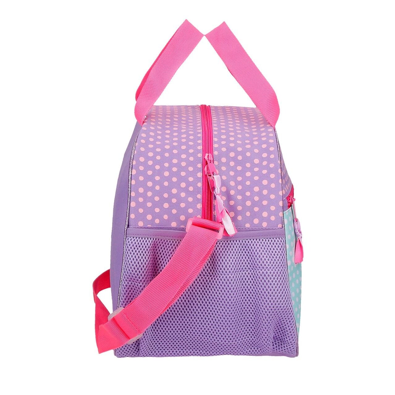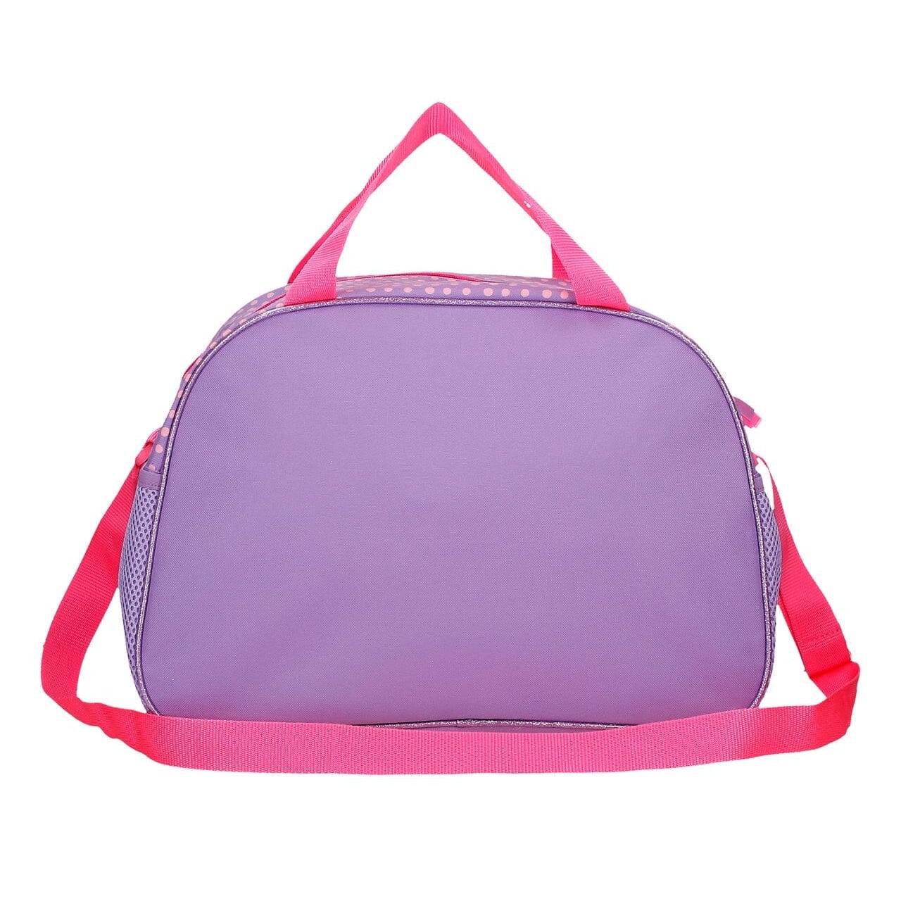 Saco de viagem Minnie com duas alças, um compartimento principal amplo com fecho, com capacidade para guardar roupa para um fim-de-semana, um bolso frontal com fecho, dois bolsos laterais em rede e alça de tiracolo ajustável.