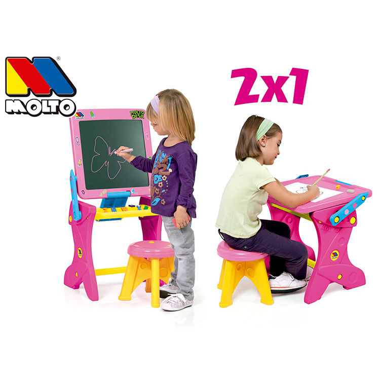 Tamanho: 48,5x36x90cm. Secretária e quadro-negro, dois em um. Ao levantar o quadro é um quadro negro, ao abaixá-lo uma mesa altamente estável. Inclui giz, lápis e muitos outros acessórios.