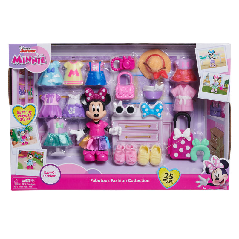 Idade: 3 anos. Esta boneca articulável da Minnie Mouse de 15 cm vem com 9 roupas fabulosas, do elegante ao esportivo, e uma variedade de acessórios com laços. As crianças podem imaginar a Minnie Mouse saindo de férias com seu travesseiro de viagem, câmera e mala de bolinhas. Ele ficará adorável passeando com seu chapéu de abas largas e óculos escuros. Suas roupas são fáceis de colocar e tirar, para que os mais pequenos possam se divertir experimentando diferentes combinações. Vestir a Minnie Mouse é uma ótima maneira para as crianças expressarem seu próprio estilo.