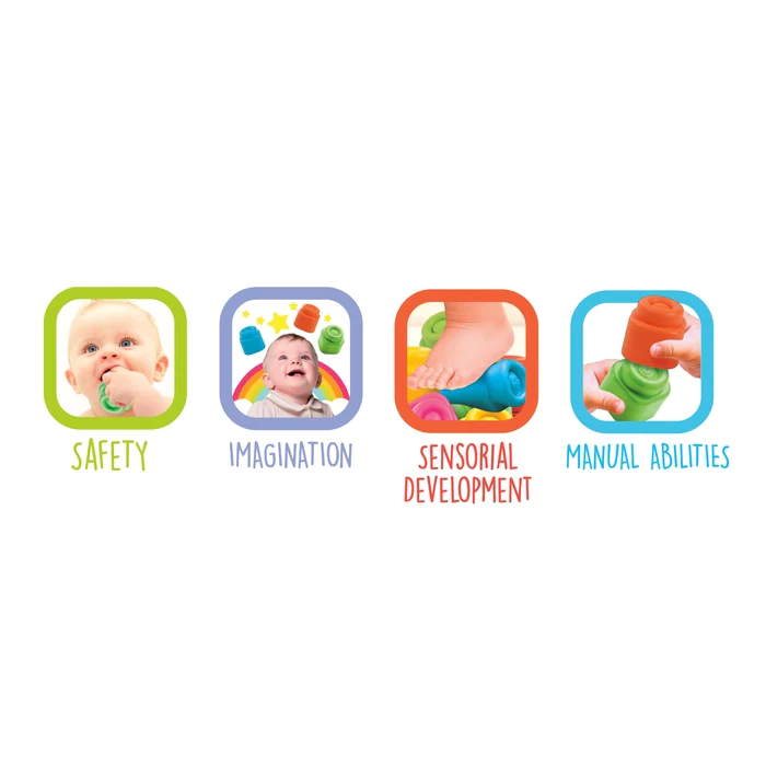 Os blocos Soft Clemmy são peças muito macias criadas para as crianças dos 6 aos 18 meses brincarem em segurança absoluta; Ideais para a exploração sensorial;