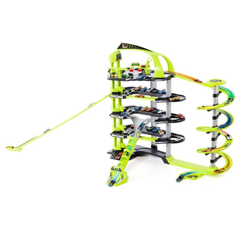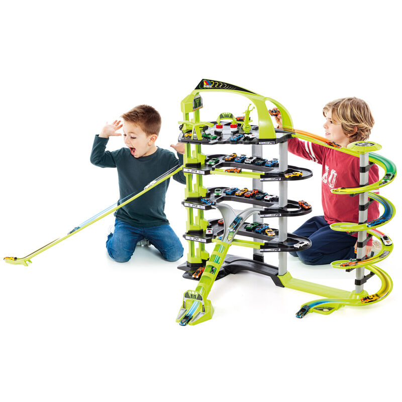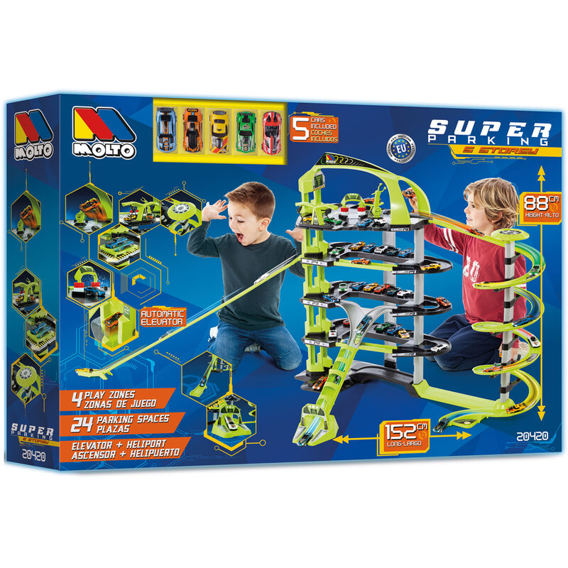 Idade: 3 anos. Tamanho: 152x88x30cm. Garagem infantil Super Mega Parking - 5 andares Moltó com 4 áreas de lazer, 24 vagas de garagem e grande número de rampas e área de lazer, elevador automático, heliporto e 5 carros incluídos. Desça rapidamente suas rampas impossíveis, lave seu carro, conserte-o e lance-se novamente.