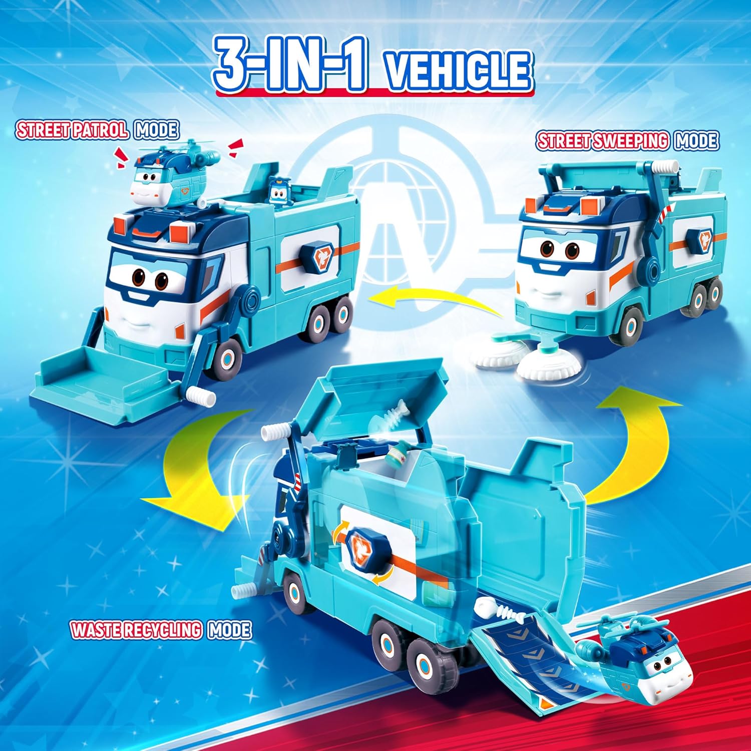 Veículo 3 em 1: possui 3 modos de jogar, modo de varrimento de rua, modo de patrulha de rua e modo de reciclagem de resíduos. O figo brilhante pode deslizar para baixo da porta traseira para uma nova missão de limpeza. Vamos começar a missão com ele!