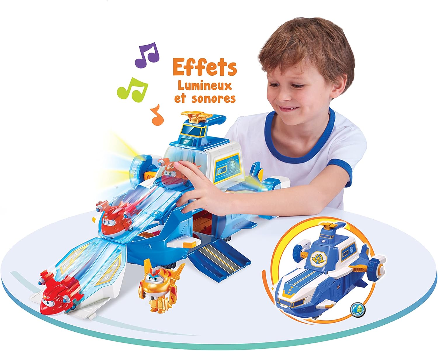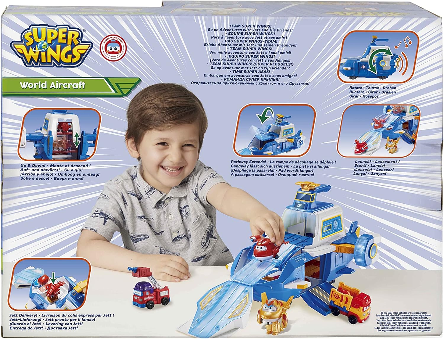 PLAYSET SUPER WINGS – O avião de brincar World Aircraft, o aeroporto voador de Super Wings, vem acompanhado pelas figuras Transform-a-Bots Jett Supercharge e Golden Boy (Teool) de 5 cm de altura da série animada Super Wings. Este conjunto inclui muitas pistas de decolagem, uma zona de controlo de operações e uma alça ergonómica para simular o voo do aeroporto. Todas as figuras Transform-a-Bots são compatíveis com este jogo.