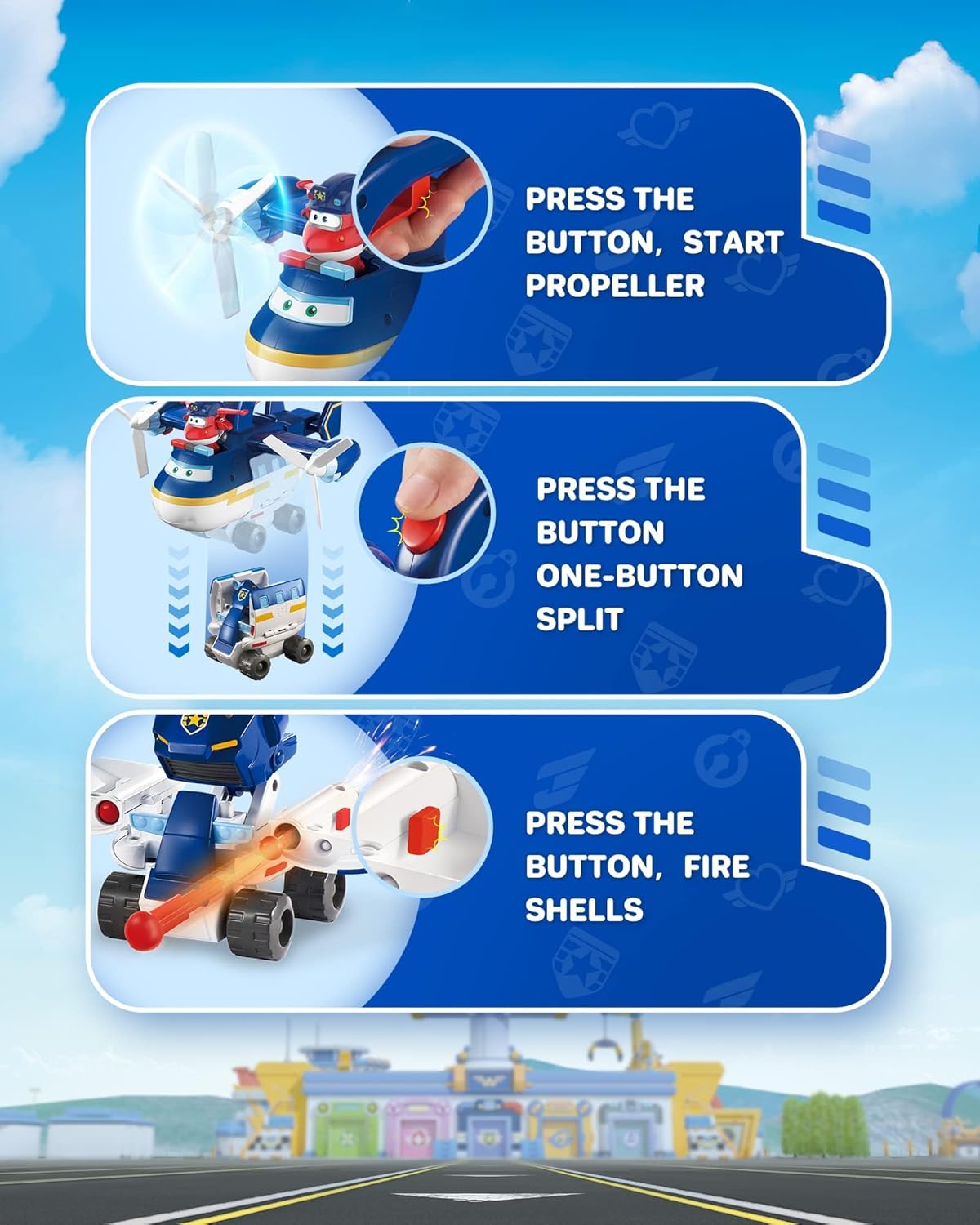 Criatividade - Graças aos seus diversos usos, o avião de brincar patrulha da polícia da série televisão Super Wings estimula a imaginação dos seus filhos, recriando as missões dos super-heróis da série animada através de diferentes experiências de jogo.
