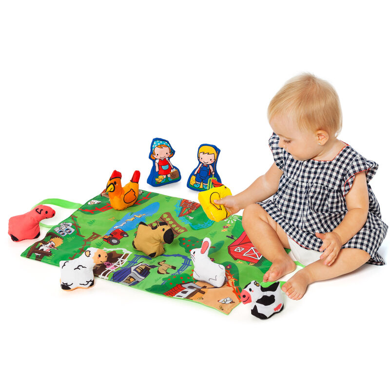 Idade: +12 meses. Tamanho: 40x27x8cm. Tapeçaria de jogo de tecido com o desenho de sua fazenda, com Lily, Marc e seus 7 animais, coloque cada animal em seu espaço, aprenda seus nomes, toque e experimente os seus diferentes sons e cores e quando terminar recolha os seus brinquedos na mesma tapeçaria que se transforma em saco.