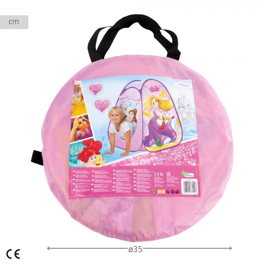 Compartilhe uma área de lazer com suas princesas Disney favoritas graças a esta barraca infantil licenciada Disney Princess adequada para uso interno e externo! Design: barraca estilo Pop Up decorada com ilustrações das princesas Disney Rapunzel, Bela e Cinderela. É confeccionada em poliéster e possui porta de enrolar e teto em tela para maior ventilação. Pop-Up: graças a este sistema, a tenda desdobra-se quando lançada, ocupando 75x75x90 cm. Ela estará pronta para brincar em segundos! Inclui: bolsa de transporte redonda com alças e zíper para dobrar e levar confortavelmente a qualquer lugar sem ocupar muito espaço (Ø35 cm) Idade e valores: recomendada a partir dos 2 anos. Desenvolve a imaginação, incentiva o jogo compartilhado e a socialização e oferece às crianças seu próprio espaço para brincar