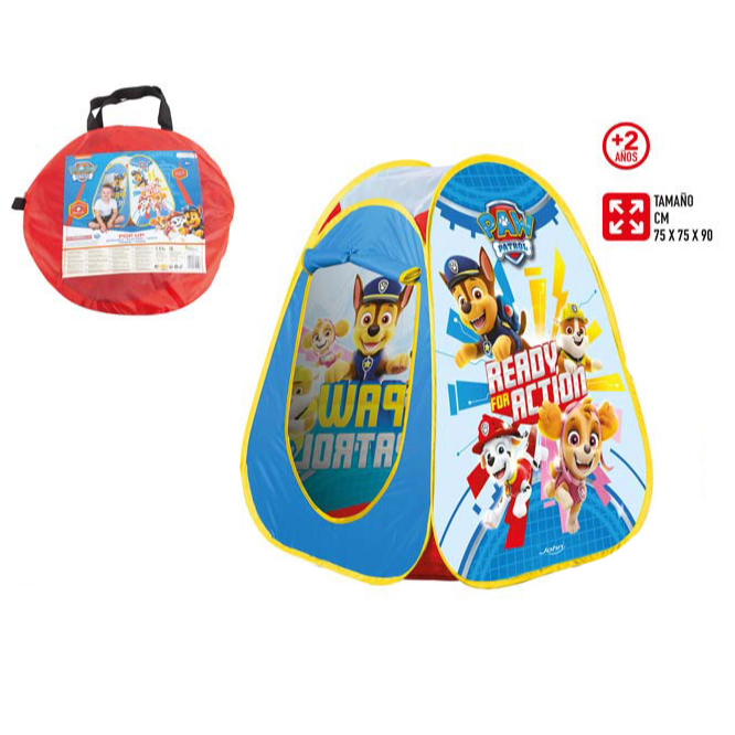 Design: tenda estilo Pop Up decorada com ilustrações da Patrulha Pata. É confeccionada em poliéster e possui porta de enrolar e teto em tela para maior ventilação.