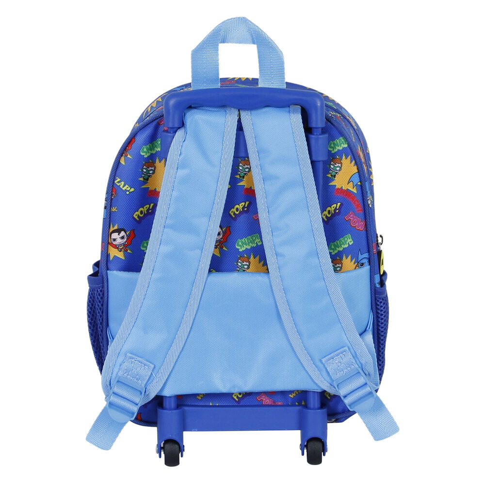 Tamanho: 34x26x11cm. (excluídas as rodas). Mochila infantil com 2 rodas e relevo frontal. Compartimento principal com zíper. Cabo telescópico de 58 cm de altura.