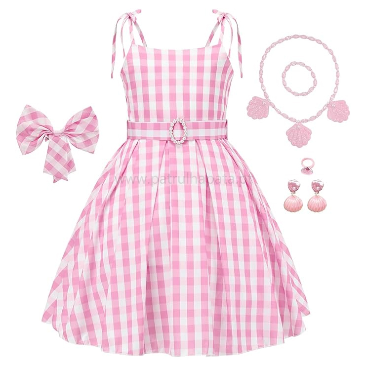 Vestido xadrez rosa: O pacote inclui um vestido xadrez rosa e branco (com cinto desmontável com fivela de pérolas), 1 nó de arco, 1 colar, 1 * pulseira, 1 par de brincos e 1 * anel.